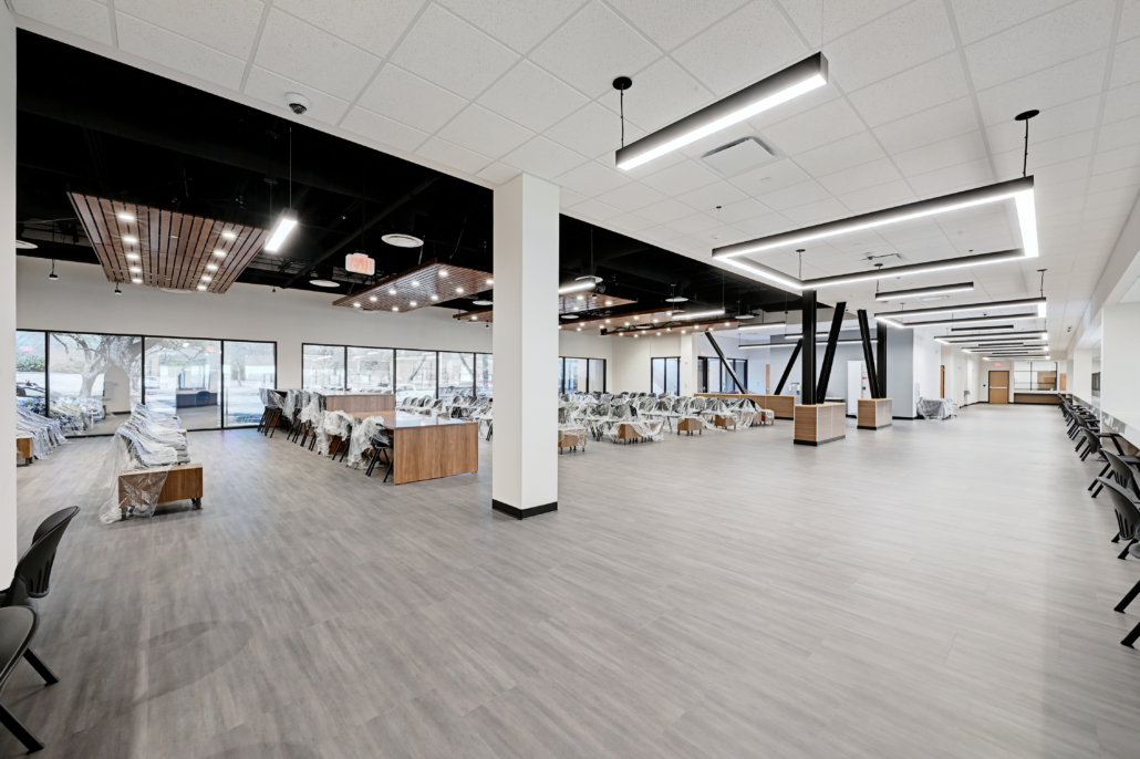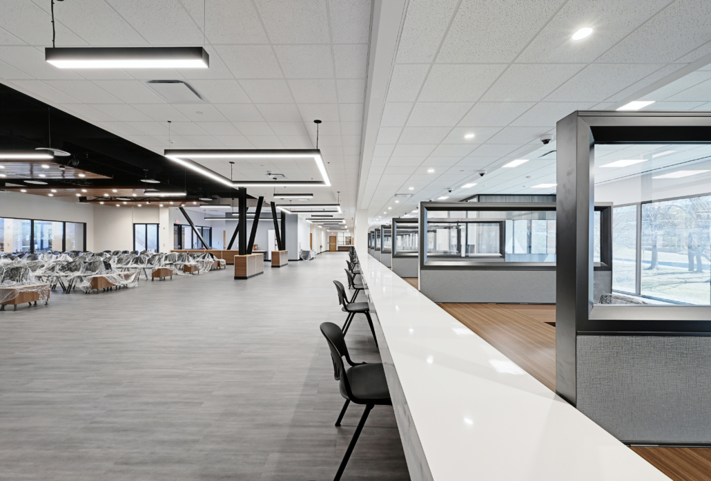 This was a bold comprehensive transformation, involving a complete gut and rebuild of an almost 50k square-foot building. Due to the vast scale of the space, extensive plumbing and a high volume of offices and cubicles were required. The waiting room and lobby feature an open ceiling with suspended, wood ceiling grids and exposed ductwork. Metal grid frosted glass walls were used as accent pieces throughout, allowing both privacy and openness. Other notable items included a vault room construction, special LED lighting, new cooling tower, and a chill water HVAC system.